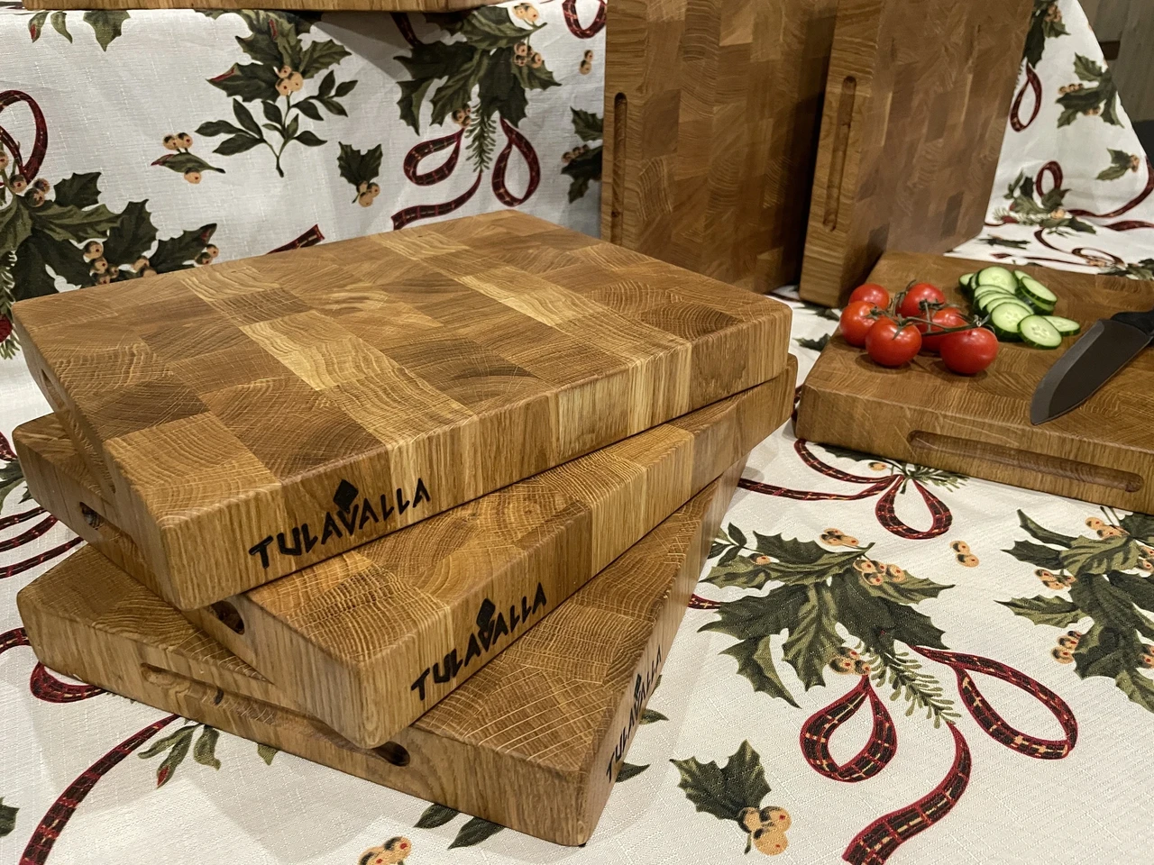 Käsitööna tammest valmistatud lõikelaud, mille puidu paigutus on ristisüüga ja see lubab noal kauem terav olla. Lõikelaual all väiksesed kumminupud, et ta ikka paigal püsiks. Viimistletud linaõli ja mesilasvahaga. Pikkus: 320 mm Laius: 260 mm Paksus: 38 mm